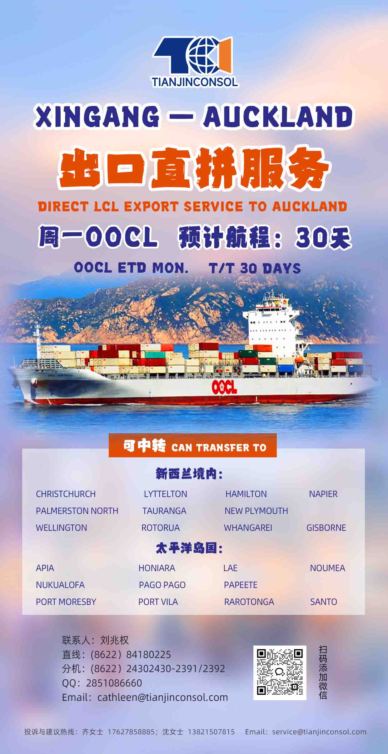 XINGANG→AUCKLAND直拼 可操作境內(nèi)外多港口