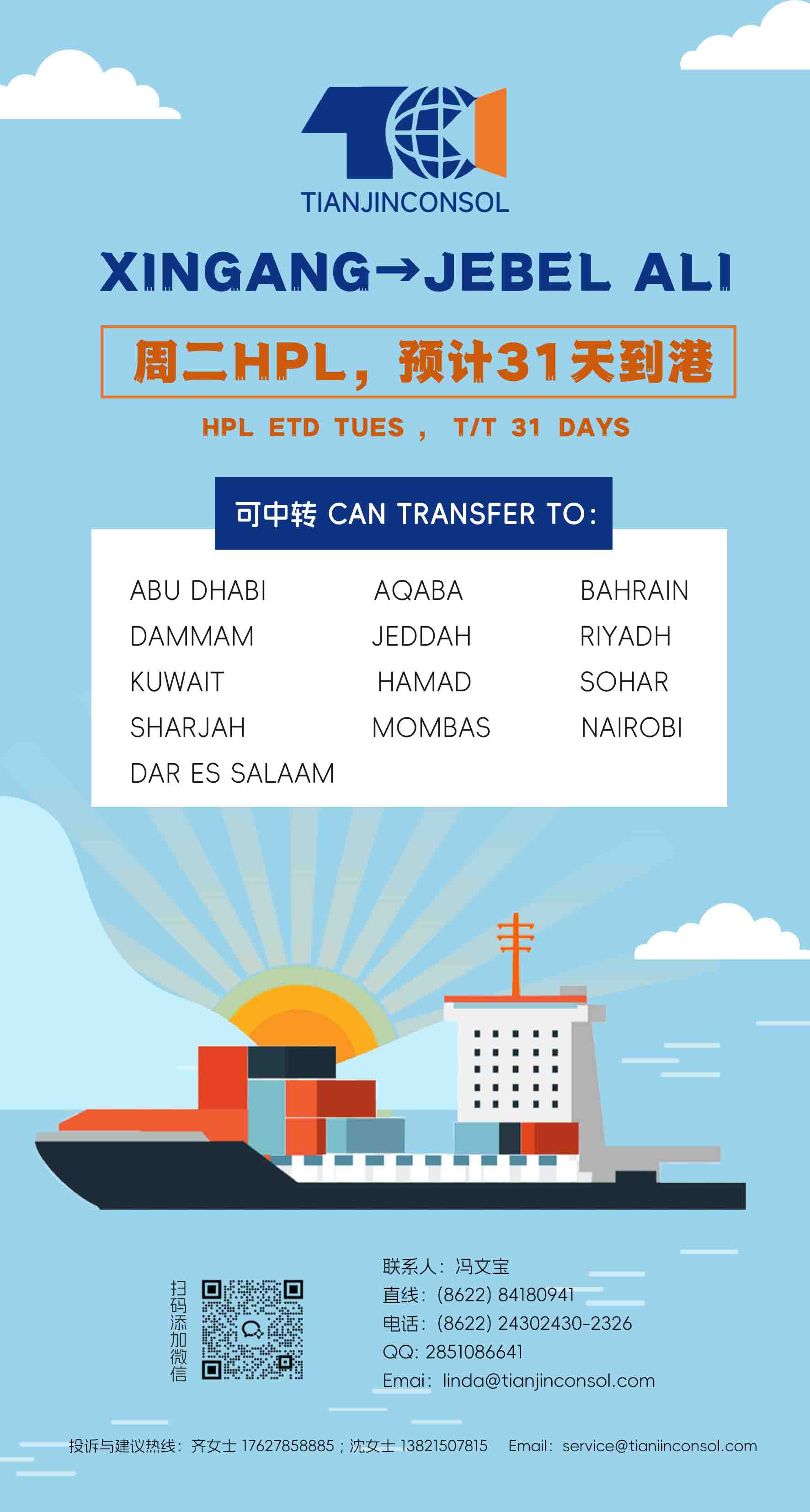 XINGANG → JEBEL ALI穩(wěn)定船期 多港口可中轉(zhuǎn)